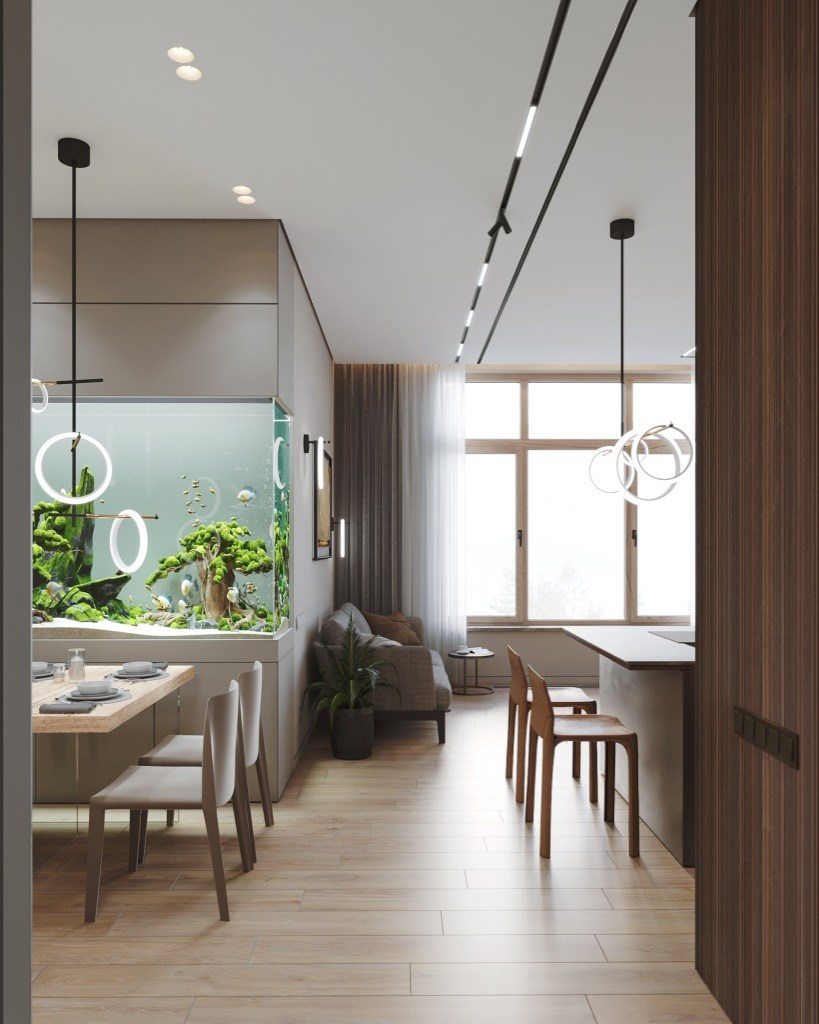 Металлические и зеркальные датали создают правильные отражения и игру пространства. Каждое членение и каждая линия подчеркивают и дополняют общую идею.